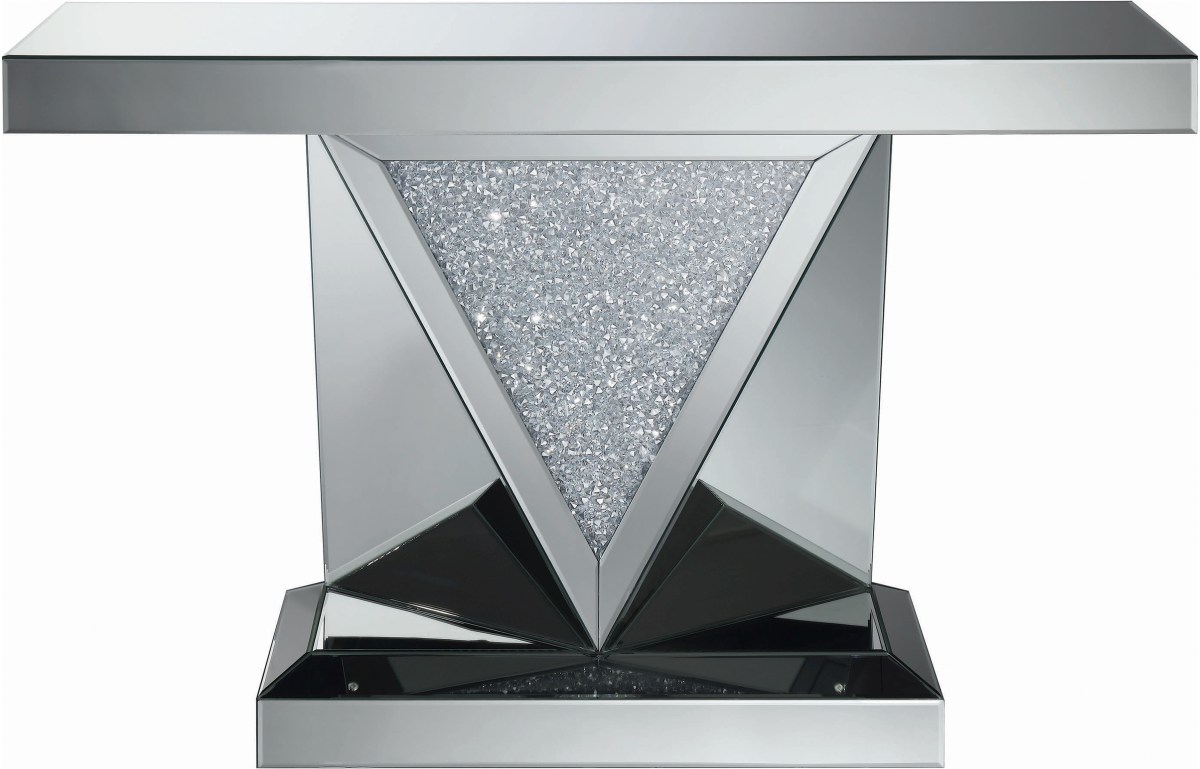 Put your posh sense of style on full display. The contemporary frame of this sleek sofa table is accentuated by a gorgeous, glittery panel in the front. Its silver finish brilliantly reflects the light, rounding out its luxurious look. Ideal for small spaces, this sleek, stylish table tucks neatly against a wall. Adorn it with flowers, photos, or artistic accents to add a decorative accent to your modern living space.