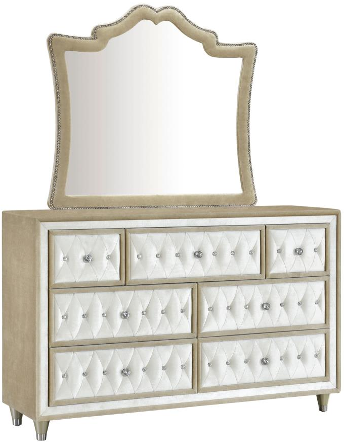 This dresser features seven drawers for ample storage, paired with a matching mirror. Upholstered in camel and ivory tones, it offers a soft, comfortable touch while keeping your bedroom organized and stylish. Perfect for storing clothing and accessories efficiently.Read More