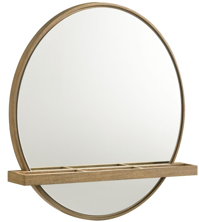 Add a chic vanity mirror over a vanity desk or your dresser to create the ideal place to get ready for the day. The mirror features a round profile with a wooden frame and straight, horizontal shelf.Read More