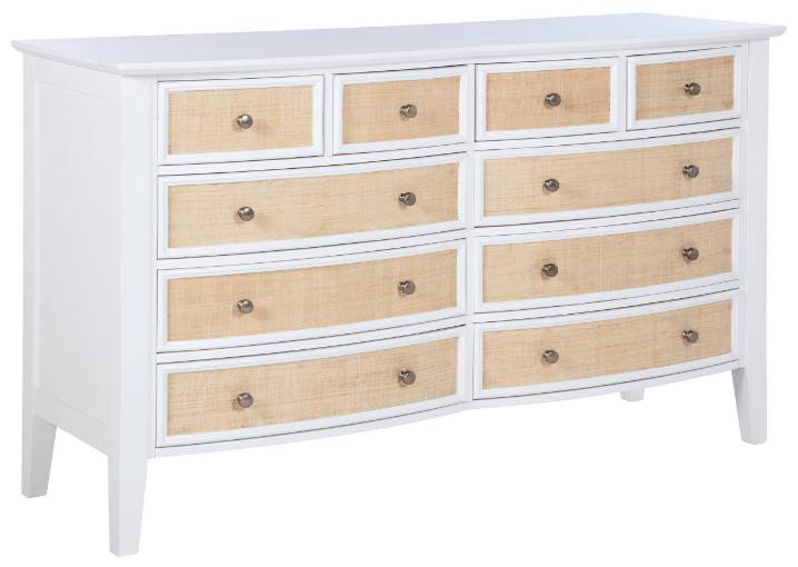 Play up approachable coastal character with a modern ten-drawer dresser in your bedroom. It shows off a gently double convex curved profile, complemented perfectly with a bright white finish that lends casual elegance. Each drawer front is adorned with natural rattan that offers the perfect dose of texture and character.Read More