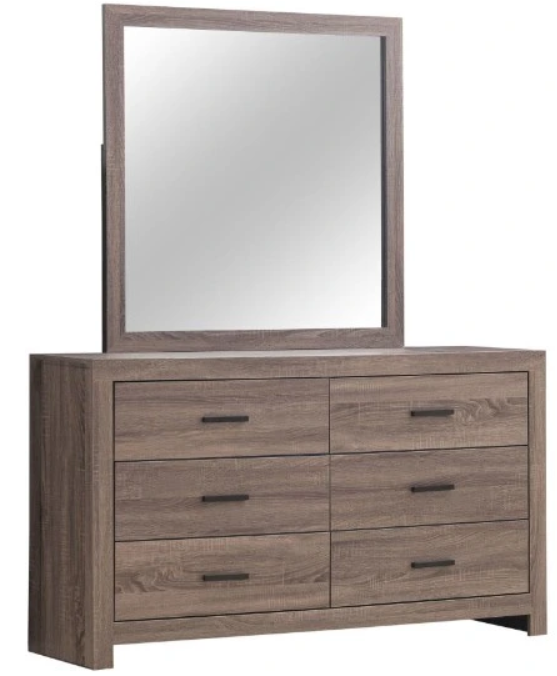 The Coaster® Brantford Barrel Oak Dresser and Mirror feature a rustic farmhouse design with a warm oak finish. The dresser offers six spacious drawers with dark bronze handles, while the matching mirror adds style and functionality, perfect for any bedroom setting.Read More