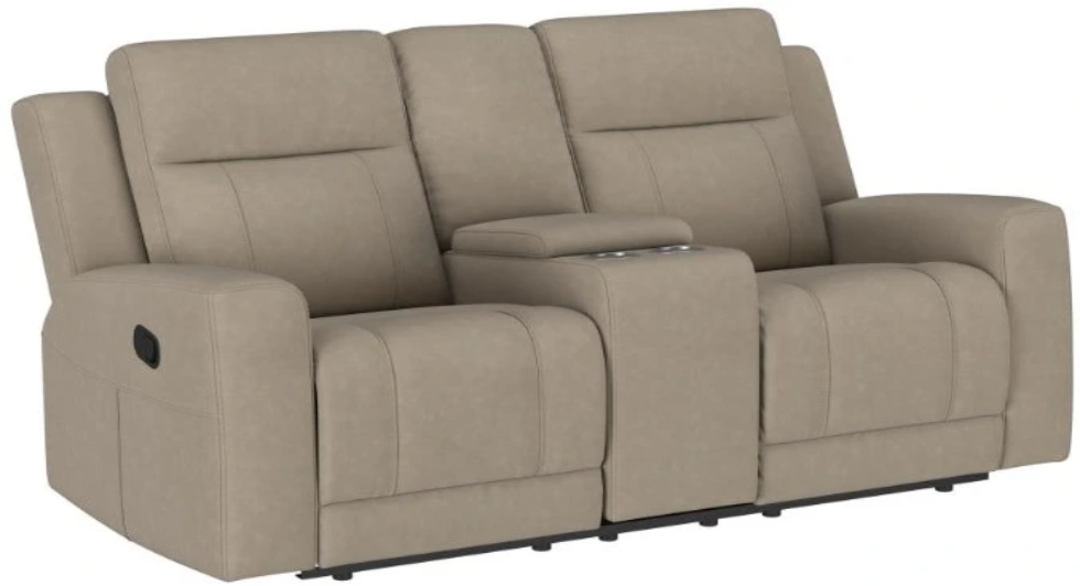 A taupe manual reclining loveseat with soft fabric upholstery and plush cushioning. It features easy-to-use reclining mechanisms and padded armrests for added comfort. Designed with a sturdy frame, it offers a cozy seating option for living rooms or entertainment spaces.Read More