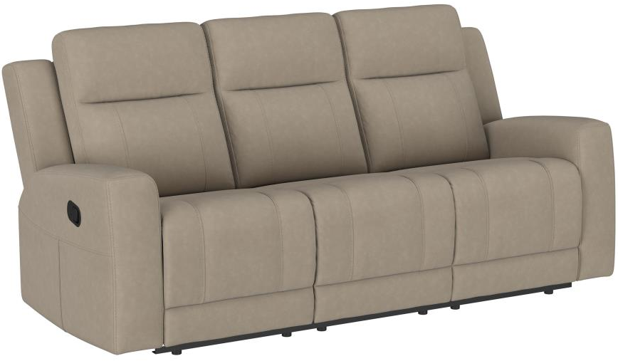 A taupe manual reclining sofa with soft fabric upholstery and plush cushioning for comfort. Features smooth reclining mechanisms, padded armrests, and a sturdy frame. Its neutral color and classic design make it a versatile addition to any living room.Read More