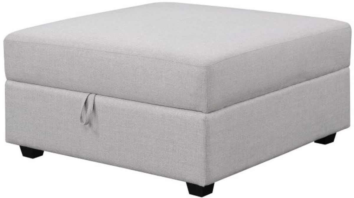 Upgrade a living room with the extra space from this grey storage ottoman. The simple silhouette showcases modern design with its clean lines. Store pillows, throws, and extra toys in the hidden compartment for a clean look. Beautiful with a variety of decor schemes, the lightly hued upholstery complements neutral and colorful motifs. Pair with the armless chairs from the modular sectional to create a chair, or place in the center for a plush footrest or extra seating.