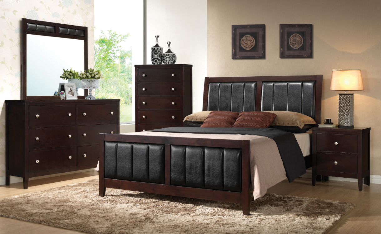 Outfit your bedroom with this transitional 5-piece bedroom set that includes everything you need to complete your sleep space: bed, nightstand, dresser, chest, and mirror. Each piece is crafted of solid wood to give you years of use and, save for the mirror, features stylish tapered legs. The bed is crafted with an imposing headboard and lower-profile footboard, each upholstered in elegant leatherette padding, as is the top of the majestic mirror. The drawers on each case piece are all adorned with lustrous nickel hardware that stands out against the stylish wood construction. This bedroom set is the perfect way to express your style and taste in your favorite oasis.Read More