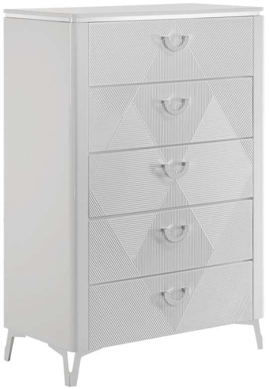 With a sleek high gloss finish and sculptural texture, this five-drawer chest makes a striking addition to the modern bedroom. Its geometric drawer fronts feature ribbed v-patterns that shift across each tier, accented by polished chrome U-shaped pulls.Read More