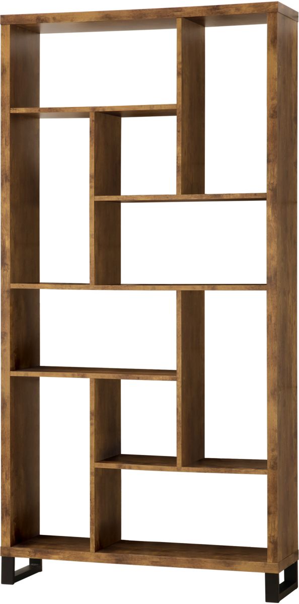 Square and rectangular sections accommodate varying heights. Finished in antique nutmeg and black, it offers a versatile palette that blends with a variety of settings.