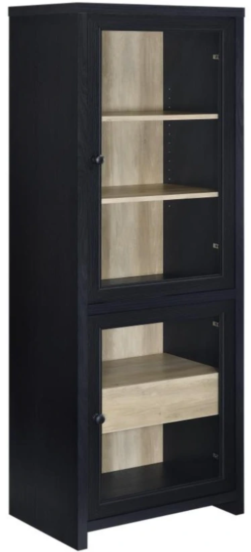 Elevate your space with a media tower that blends quiet elegance and thoughtful design. Wrapped in a bold black finish, this two-door cabinet reveals a rich interior contrast and graceful utility. Framed glass doors showcase your favorite pieces above, while a hidden drawer below offers a secret haven for everyday essentials.Read More