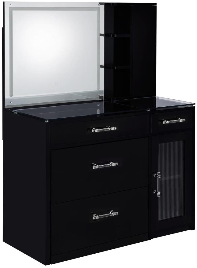 The Coaster® Flora 2-Piece Black High Gloss Vanity Set with LED Mirror features a stylish black high gloss finish that adds a modern touch to any space. The set includes two pieces for added functionality, with the LED mirror providing enhanced lighting for grooming. Perfect for both elegance and practicality.Read More