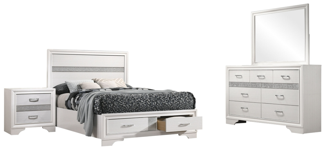 Create a stunning bedroom ensemble that's fit for modern royalty. Each gorgeous piece in this four-piece set flaunts silvery, sparkling accents for a truly glamorous look. The bed features a solid, straight silhouette and two storage drawers built into the base.Read More
