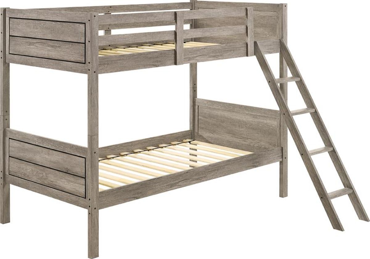 Minimal, clean shapes and lines invite you to rest in this transitional bunk bed. Designed in a weathered taupe finish accented by a dark border along the sides, this understated bunk bed is the perfect addition to a modern farmhouse home, or a contemporary bedroom suite shared by siblings.Read More