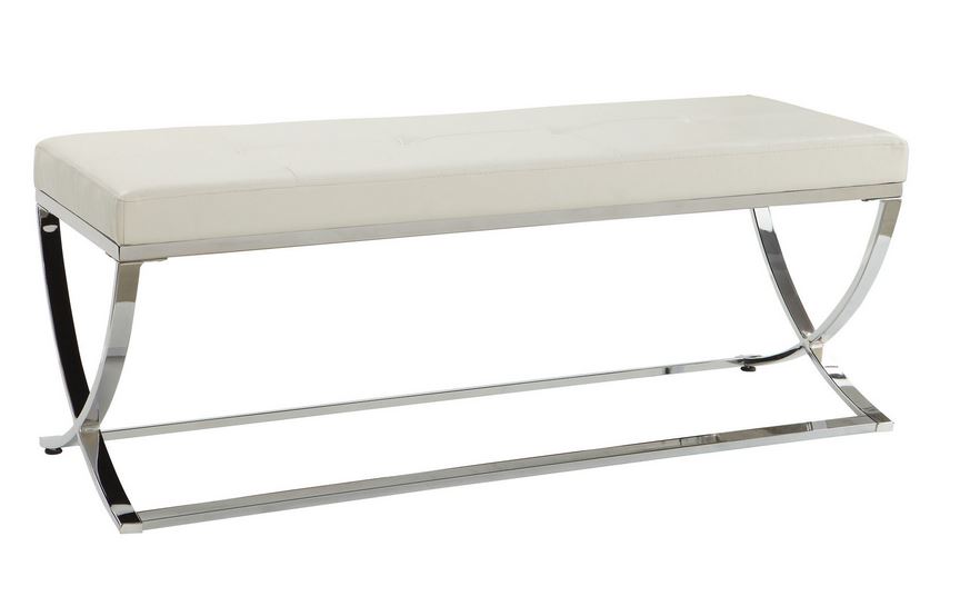 Coaster® Bench with chrome-silver metal base and leather material light and airy ambiance offer a lift to modern bedrooms and living spaces. With a tasteful minimalist profile, this elegant bench delivers a perfect blend of style and substance. Sit on a padded surface wrapped in white leatherette upholstery. Enjoy the romantic accent of a chrome finish metal frame with gentle contours. Choose this bench for overflow seating in a central room, or an intriguing addition to entryway spaces.Read More
