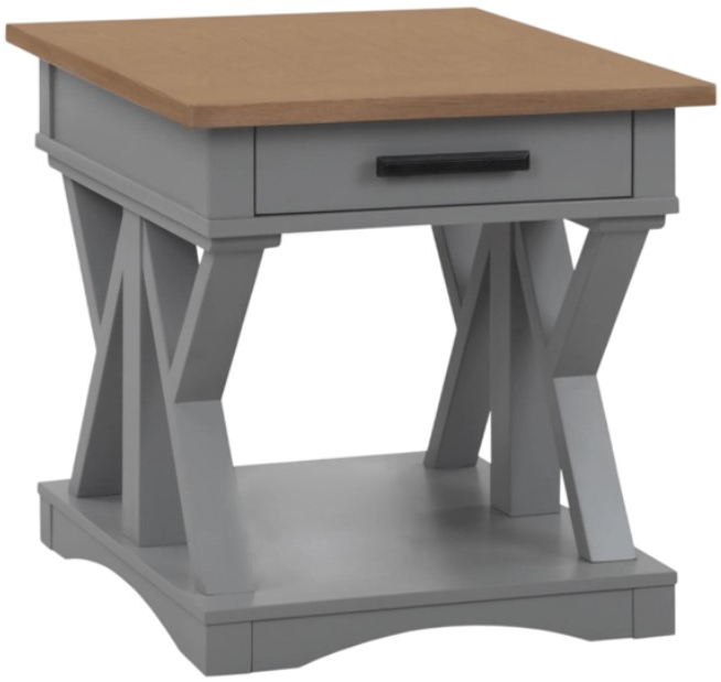 The Americana Modern end table is where fun meets function. Its classic design character is highlighted in a versatile dove gray finish and features a contrasting wood-grain top in weathered natural. The open area below is perfect for storage while its center drawer and crossbeam silhouette create a stunning visual.Read More