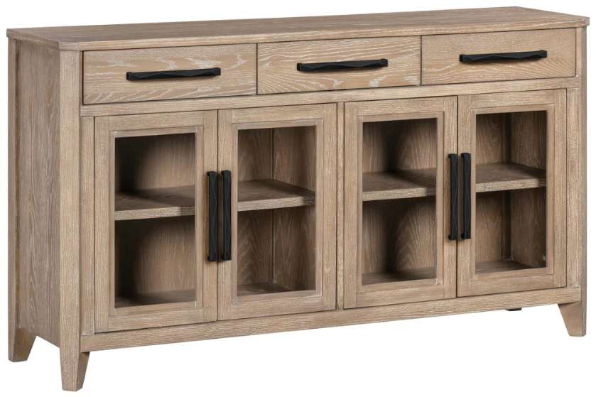 Buffet features soft-close, felt-lined drawers, glass inset doors for decorative display and adjustable shelves