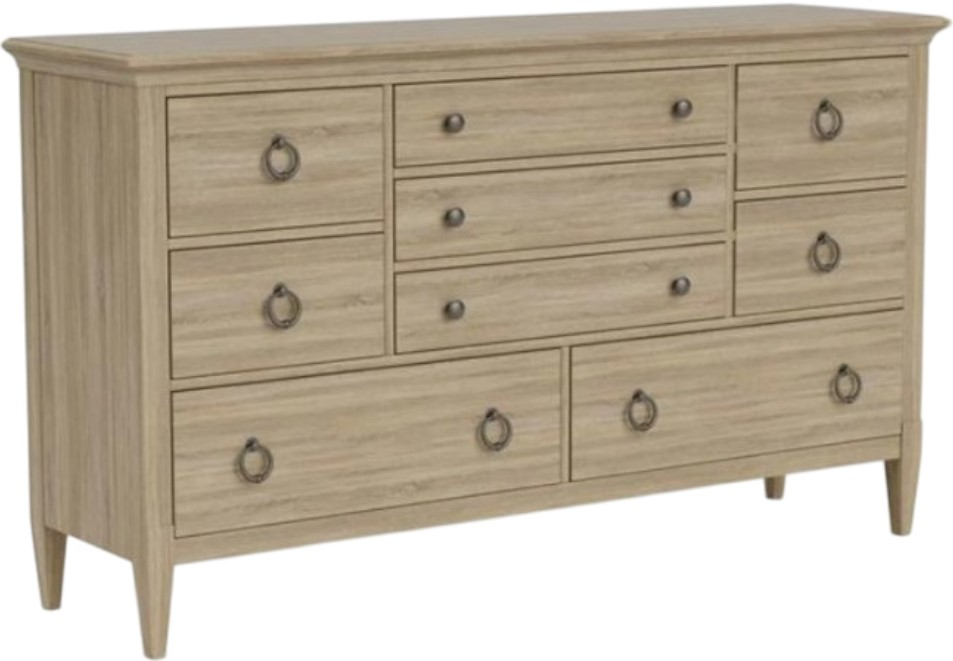 Elevate your bedroom with this nine drawer dresser from Gavin, shown in a nutmeg and generously scaled custom ring pull in an antique pewter finish. Nicely shaped top molding, subtly tapered legs lift cases off the ground. Make a bold statement by incorporating this piece to your home decor.Read More