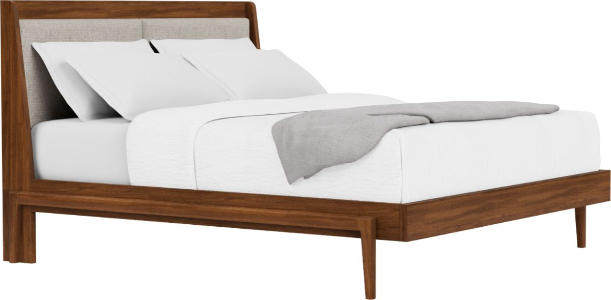 Constructed of select hardwood solids and random matched Walnut veneers with a sleek low profile headboard. Two plush upholstered panels covered with 100% polyester. Unique taper legs are integrated into the rails.Read More