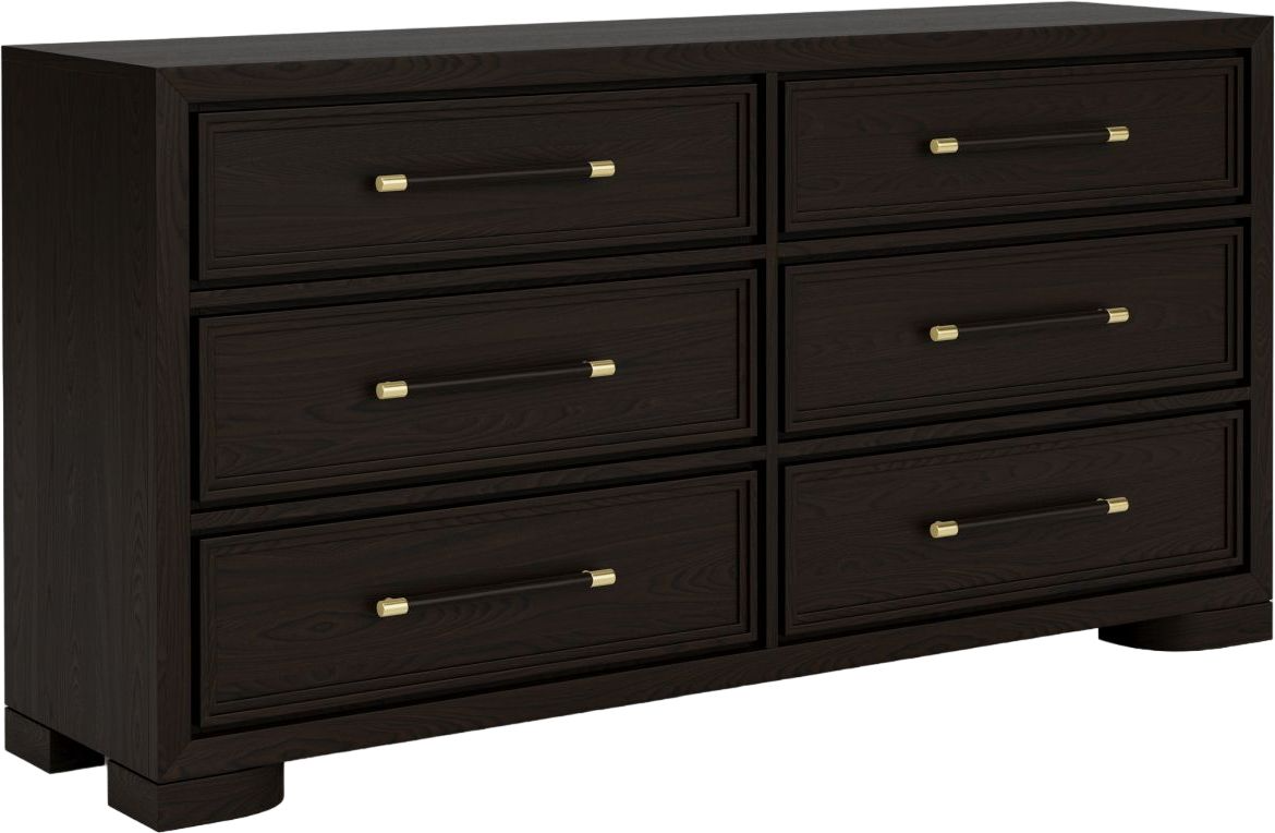The Lydia Six Drawer Dresser is constructed of select hardwood solids and random matched oak veneer and has unique block feet that subtly curve back under the case. Each drawer is framed with sleek multi stepped molding for an elegant finish.Read More