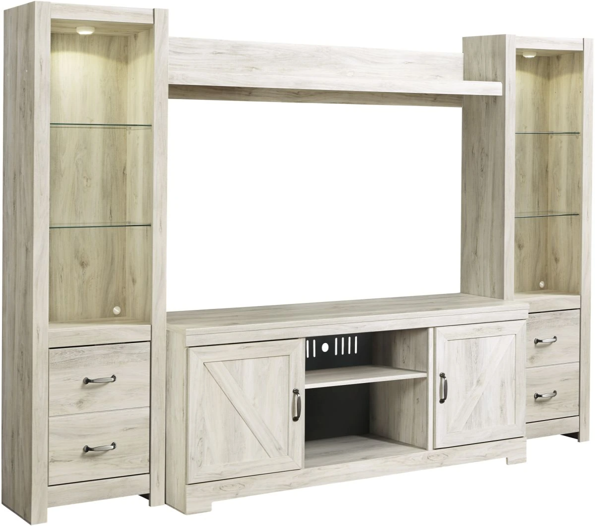 Express your farmhouse style with this entertainment center. Its wispy white finish over replicated oak wood grain is a delightful change from the ordinary. Clean-lined, classic styling with barn door inspiration provides a country chic aesthetic that’s a breath of fresh air.Read More